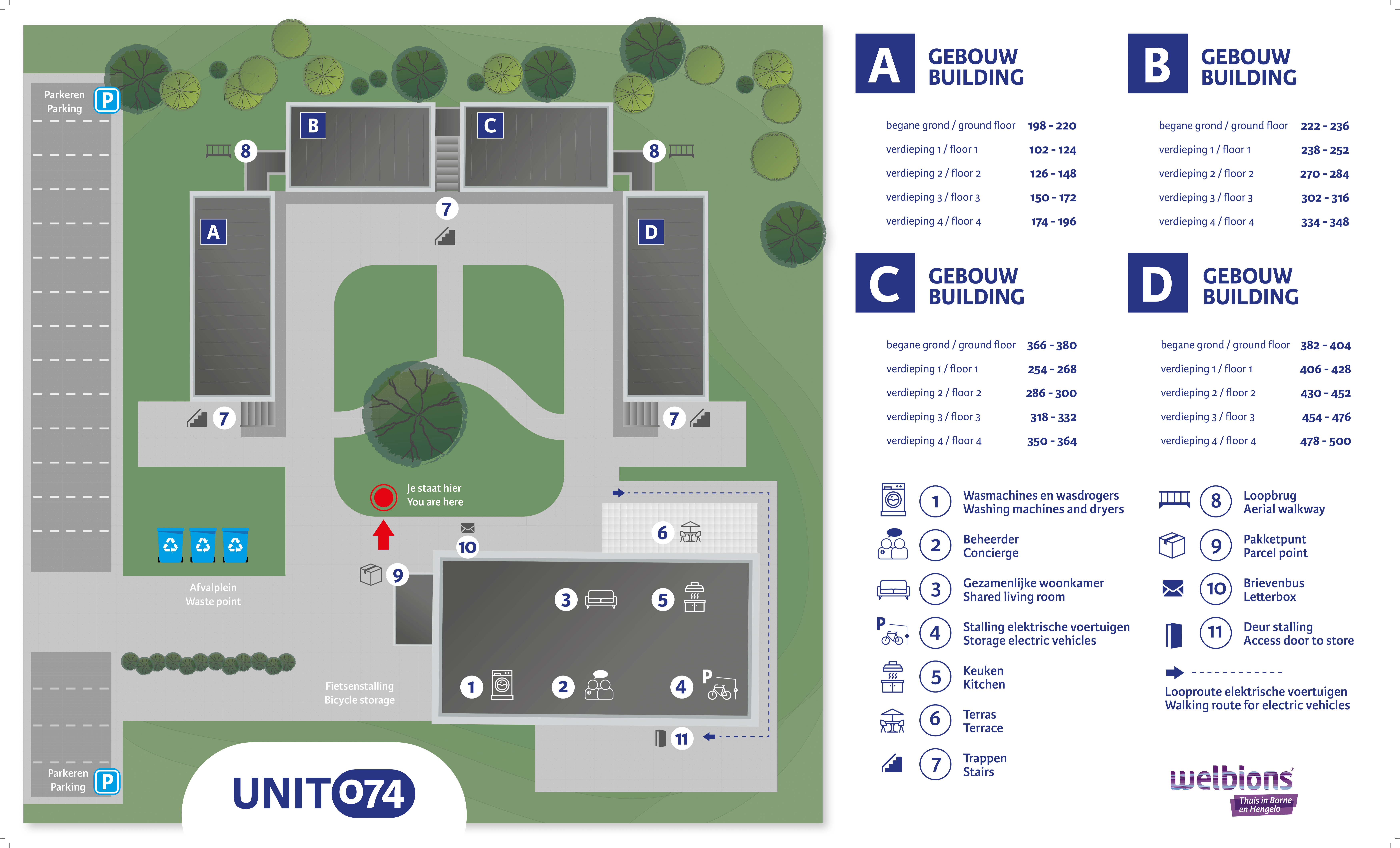 UNIT074 bestaat uit vier woongebouwen rondom een gezamenlijke binnentuin. Er zijn gedeelde voorzieningen, zoals een gemeenschappelijke huiskamer mét keuken en een wasserette voor wassen en drogen. De tuin tussen de gebouwen is een heerlijke plek om te ontspannen en met medebewoners bij te kletsen.